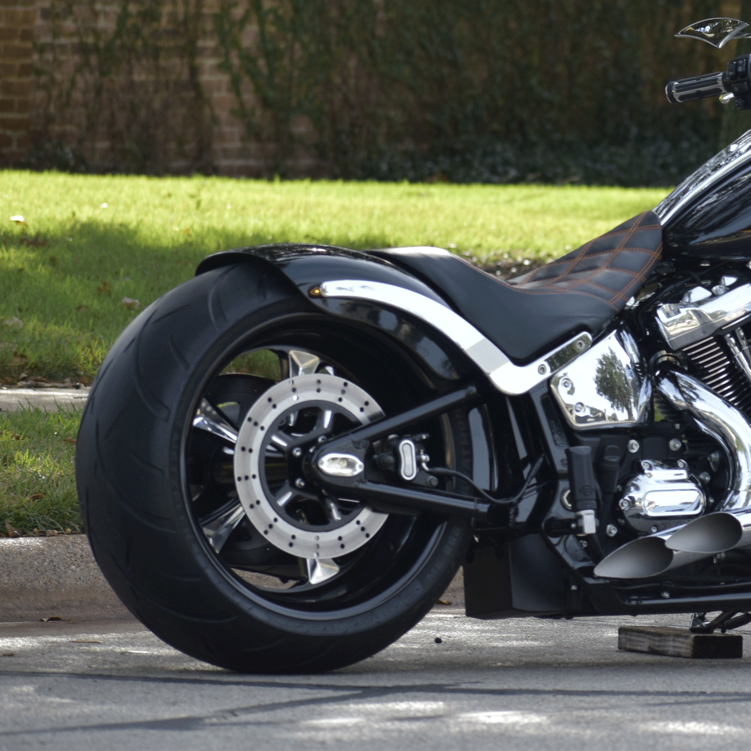 This Custom Wide Tire Conversion Kit Fender includes: Billet Aluminum Slotted Fender Struts, Raw Steel Fender and Raw Steel Rock Guard, Leather Topped Seat, Custom mono shock M-8 Softail Steel Swing Arm, Primary Off Kit, 20mm aka 3/4" drive Belt